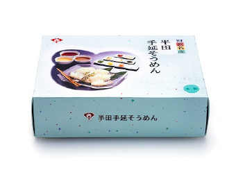 切断した素麺は、100gずつ計量、結束し、金属検出機を通し目視による品質チェックを行ない、麺包紙に巻いて箱詰めします。