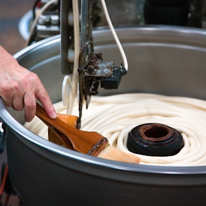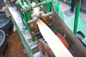 麺帯をロールに通して、徐々に細い麺紐(めんひも)にしていきます。